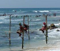 斯里兰卡西南海岸水清沙幼,从古城加勒(Galle)到观鲸胜地美瑞莎(Mirissa),沿途经常可见茫茫海面上插着简陋的高木杆,木杆下端每隔约一尺就有一段横木条,以供肤如炭色的渔民踩蹬和坐在木杆上垂钓,远望如同在海中踩高跷;偶有艳阳下划过海天的银光一闪...