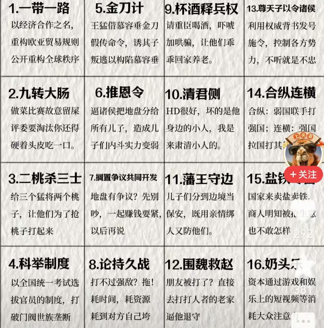 |  第一名:推恩令 推恩令之所以被人称为千古第一阳谋,是因为此计谋无人可以破解!推恩令是汉武帝为了巩固中央集权在郡县制上改进的措施。原本诸侯的地盘只由长子继承,改成长子、次子、三子共同继承。诸侯明知道被坑了,但是挡不住子女们都想争地盘。诸侯国慢慢越分越小,汉武帝再趁机削弱他们势力。根本无解! 第二名:围魏救赵 魏国军队围着赵国的首都邯郸,打了好长时间,赵国眼看着打不过了。这个时候就向齐国求救了,田鸡(修改:忌)领兵孙膑当军师,带兵去救赵国,田鸡(修改:忌)原本想着直接杀到邯郸去硬刚推塔。 但是孙膑不这么想,认为不应该直接动手,套路他们一下不损失兵力解决问题更好。 商量完就带着大部队去了魏国的都城大梁猛攻。 魏军在庞涓的带领下回城,回城路上中被孙膑埋伏的人怼了一通。 孙膑给了庞涓两个选择。一个是这场战役让你赢,但是你们大王那里让你输,以后再不敢用你了。一个是回来挨揍。 人生就是这样,有时候看似有的选,其实没得选。被人拿捏的死死地。 第三名:二桃杀三士 拿两个听说可以延年益寿的桃子,让三个大老粗功臣按功劳分。无论如何,必定会有一个人分不到,矛盾就会产生,被激化。但是,同为武将,谁又会甘拜下风呢?只能说晏子这人太聪明了。 第四名:杯酒释兵权 赵匡胤当上了皇帝就请一块打天下的兄弟们喝酒。告诉他们当初是他们推自己上来的,以后万一再有人推你们上来,那我怎么办?要不你们回家种田去吧,多分你们点地,回去当地主。 听到这话的将士都表示赞同。 看似给了两种选择,可以不回去种地,但是不种地可能第二年就长坟头草了。 第五名:挟天子以令诸侯 第六名:清君侧 朱棣带兵搞侄子的皇帝位置,拿侄子旁边的人不听话乱搞当旗子。 我可不是不是谋反,我是收拾皇帝身边的奸臣! 明知道他在胡说八道就是在谋反,但是根本没办法破解! 第七名:合纵连横 合纵就是联合弱国共同攻打强国,连横就是联合强国制衡第三国。 你明知道他的意图,但是无法破解。 第八名:围点打援 我军攻打国军的时候,最擅长的打法。 攻打一个地方,但是围起来不打下来,让对方喊援兵。并在来的路上埋下伏兵。敌方不救就吃掉,救就吃掉来的援兵。 无解! 第九名:论持久战 在抗战最困难的时候,很多人丧失了抗战的信心。教员发表了论持久战。提出了抗日战争必然胜利,是需要持久抗战的。敌人也能看到这种观点,但是毫无办法。 第十名:九转大肠 九转大肠,来自于一项节目。 一名厨师做出了一份九转大肠, 评委谨慎的问他,这大肠清洗干净了吗? 他自信的回答,处理干净了,但是保留了一点大肠的味道。 作为一档美食节目, 评委如果不吃就要让他过关, 如果尝,那就正中了厨师的计谋。 看似有的选,其实都是套路。 根本无解! |