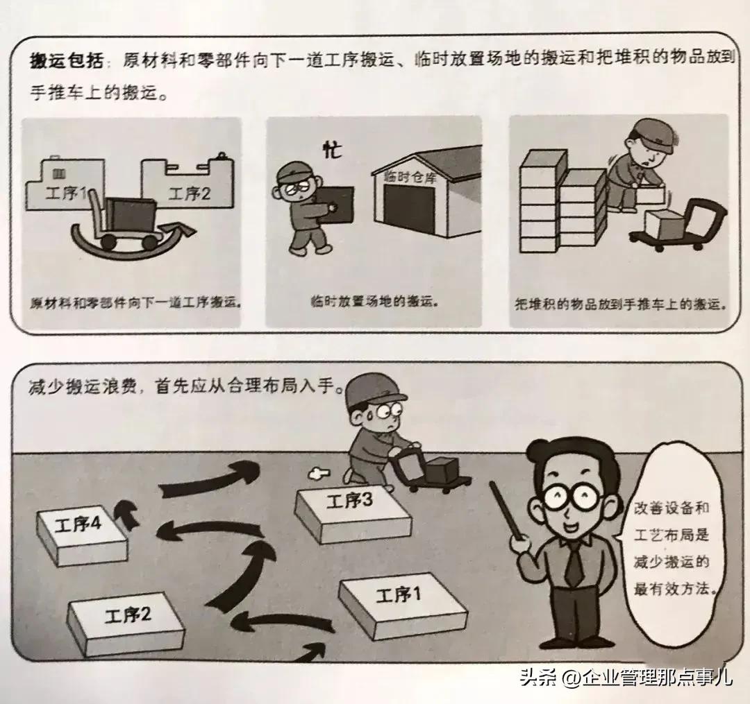 (六)价值流管理 价值流是指从原材料转变为成品、并给它赋予价值的全部活动,包括从供应商处购买的原材料到达企业,企业对其进行加工后转变为成品再交付客户的全过程,企业内以及企业与供应商、客户之间的信息沟通形成的信息流也是价值流的一部分。 一个完整的价值流包括增值和非增值活动,如供应链成员间的沟通,物料的运输,生产计划的制定和安排以及从原材料到产品的物质转换过程等。 【价值流的特点】 (1)隐蔽性,价值流是在整个供应链的运作过程中,需要有关人员去挖掘; (2)连续性,价值流是在供应链上连续不断地进行的; (3)周期性,产品有其生存周期和生命周期,产品的生产、销售随着季节不同有其周期性,体现出了价值流运作的周期性。 价值流管理就是把整个企业解构成若干个价值流,企业的管理和业绩考核都沿着价值流进行,每个价值流都将涵盖多个功能单元,其运营也需要大量人员的支持。 第七层:七大浪费 (一)搬运浪费 搬运动作遍及生产活动中的各个流程,包含放置、堆积、移动、整理等动作,但是搬运并不能产生附加价值,所以它本身就被认为是一种浪费。 搬运包括原材料和零部件向下-道工序搬运、临时放置场地的搬运和把堆积的物品放到手推车上的搬运。其中,设备布局不合理、生产线布局不合理、工序流程不合理等是造成搬运浪费的主要因素。 解决办法:应从合理布局入手,尽可能减少搬运。