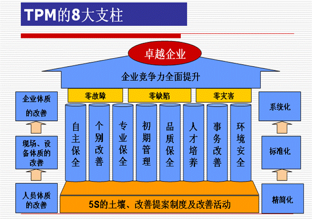 (TPM目标示意图) TPM管理的目标可以概括为四个“零”,即停机为零、废品为零、事故为零、速度损失为零。 (1)停机为零: 指计划外的设备停机时间为零。计划外的停机对生产造成冲击相当大,使整个生产品配发生困难,造成资源闲置等浪费。计划时间要有一个合理值,不能为了满足非计划停机为零而使计划停机时间值达到很高。 (2)废品为零: 指由设备原因造成的废品为零。“完美的质量需要完善的机器”,机器是保证产品质量的关键,而人是保证机器好坏的关键。 (3)事故为零: 指设备运行过程中事故为零。设备事故的危害非常大,影响生产不说,可能会造成人身伤害,严重的可能会“机毁人亡”。 (4)速度损失为零: 指设备速度降低造成的产量损失为零。由于设备保养不好,设备精度降低而不能按高速度使用设备,等于降低了设备性能。 3、推行TPM的要素 推行TPM要从三大要素上下功夫,这三大要素是: (1)提高工作技能: 不管是操作工,还是设备工程师,都要努力提高工作技能,没有好的工作技能,全员参与将是一句空话。 (2)改进精神面貌: 精神面貌好,才能形成好的团队,共同促进,共同提高。 (3)改善操作环境: 通过5S等活动,使操作环境良好,一方面可以提高工作兴趣及效率,另一方面可以避免一些不必要设备事故。现场整洁,物料、工具等分门别类摆放,也可使设置调整时间缩短。 4、TPM开展步骤 具体开展过程可分为三个阶段,10个具体步骤。 第一阶段:准备阶段 (1)TPM引进宣传和人员培训 按不同层次进行不同的培训 (2)建立TPM推进机构 成立各级TPM推进委员会和专业组织 (3)制定TPM基本方针和目标 提出基准点和设定目标结果 (4)制定TPM推进总计划 第二阶段:引进实施阶段 (5)制定提高设备综合效率的措施 选定设备,由专业指导小组协助改 (6)建立自主维修程序 (7)做好维修计划 (8)提高操作和维修技能的培训 (9)建立设备初期的管理程序 第三阶段:巩固阶段 (10)总结提高,全面推行TPM 总结评估,找差距,制定更高目标。