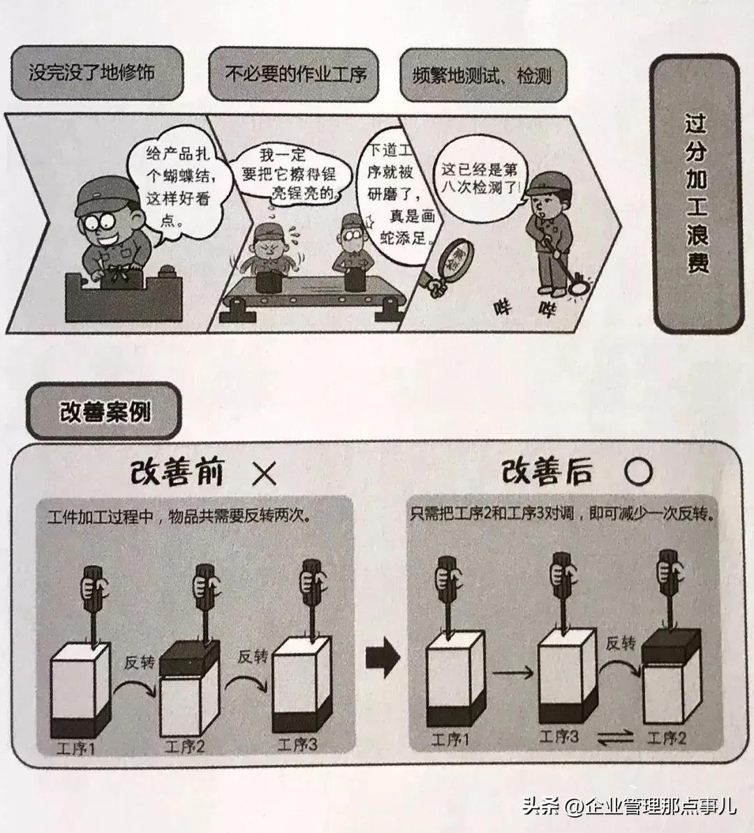 (五)过度加工浪费 过度加工浪费是指加工质量或精度超过了下道工序需求或客户需求而造成的过度加工的浪费。例如,没完没了地修饰,频繁地测试、分类、检测。这些白白浪费了过多的工时、原材料和设备损耗等。在降低过度加工浪费的过程中可以对一些工序可以省略、合并或简化等。