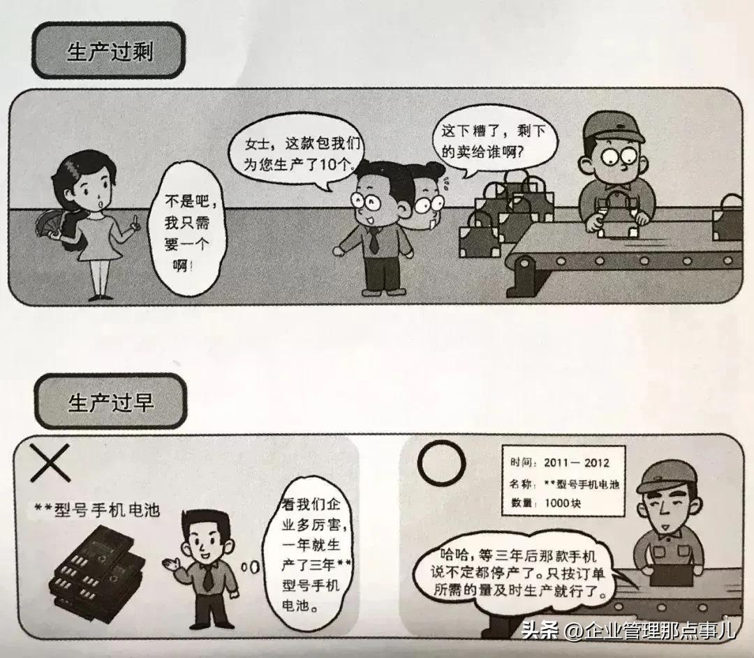 (六)生产过剩的浪费 生产过剩包括生产过多和生产过早两个方面。生产过多主要是由生产不均衡所造成的。出现了不均衡情况,本应停线追溯其原因,以便及时发现问题,但过量生产有可能使原因无从查起。生产大量没有卖出去的产品,不仅占用资金、生产空间和仓储空间,增加搬运和库存的浪费,而且还会掩盖生产过程已经出现的各种偏差、浪费和不合理,白白丢掉了改善的突破口。 如果生产过早,一年内干完了三年的活,那么就等于产生了两年时间的库存。这种情况不能说明生产效率高,反而说明生产管理混乱、劳动定额不合理和生产不均衡等。 解决办法:遵循JIT生产的原则,只把需要的产品,在需要的时候,按需要的量生产出来即可。