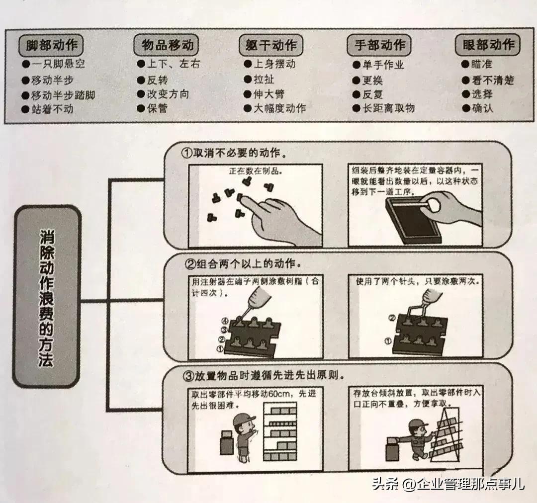 解决办法:根据人体工程学进行动作研究,合理摆放设备,生产标准化,制作工具,对设备进行必要的改造。