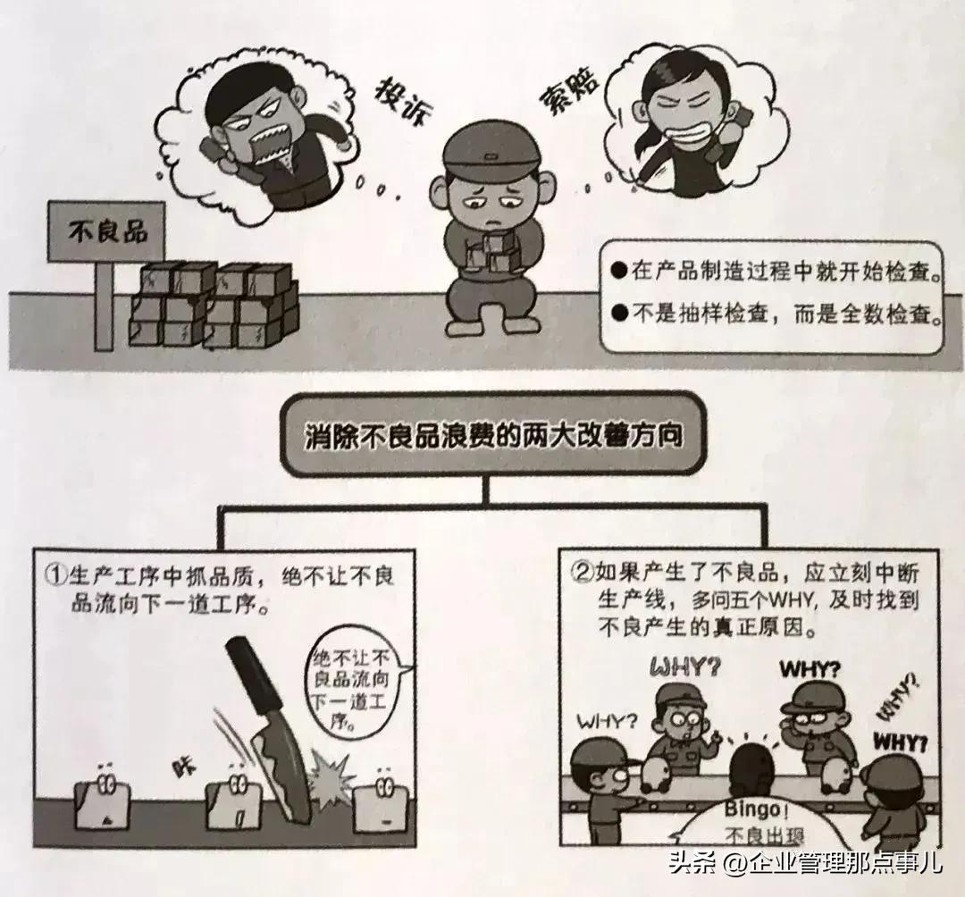 (七)不良的浪费。 不良品浪费是指持续生产出不合格产品,在产品检验、报废或返修活动中所造成的材料、机器和人工等浪费。如果不良品流向市场,则会引起顾客的投诉和产品召回等更大的损失。 消除不良品浪费的两大改善方向为: ①生产工序中抓品质,绝不让不良品流向下一道工序,目标是做一批产品就合格一批产品,追求质量的零缺陷; ②如果产生不良品,应立刻中断生产线,多问五个WHY,及时找到不良产生的真正原因。 做到不接收不良,不制造不良,不流出不良。