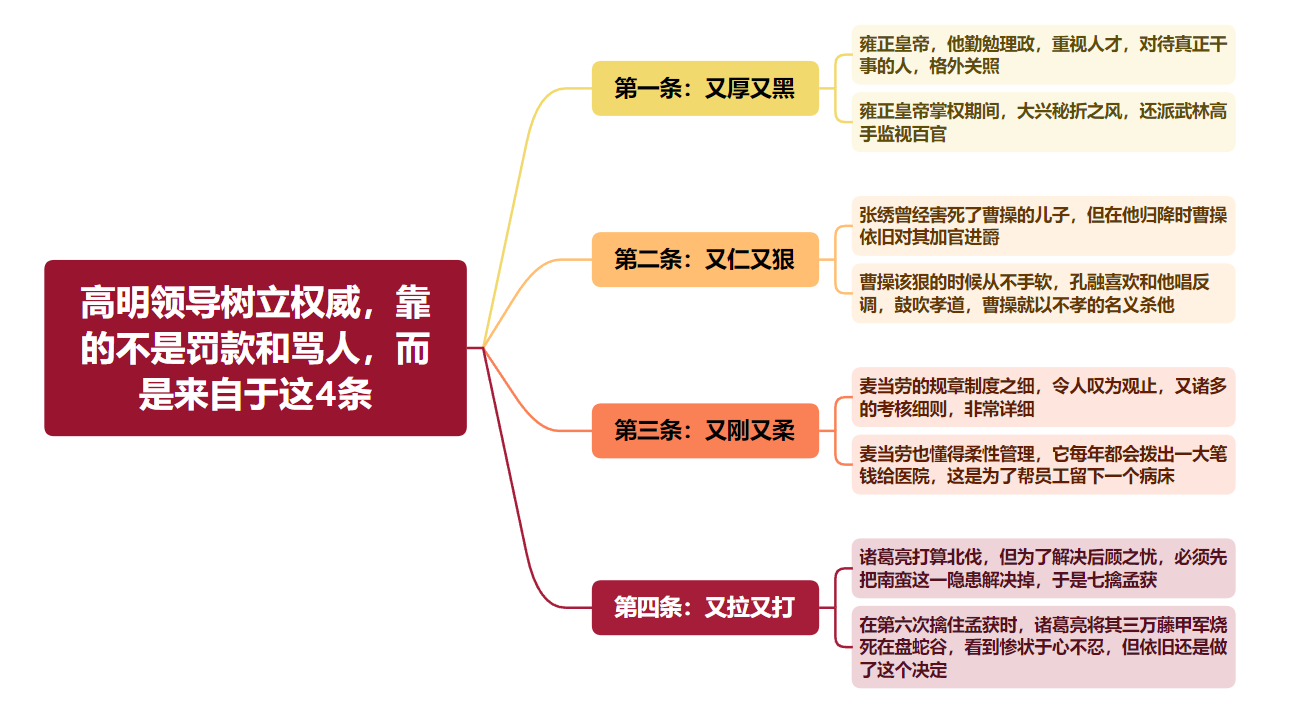 很多人“一早权在手,便把令来行”,自以为只要严刑峻法,就能让下属心生畏惧,产生敬畏感,从而树立自己的权威。 我们常说:没有管不好的下属,只有不会管的领导。 要想下属对你心服口服,没有两把刷子,根本不可能。 高明领导带团队,从不靠骂人或罚款来树立权威,而是通过做好以下这4条。尤其是最后一条,至关重要。 第一条:又厚又黑 1:厚 比如雍正皇帝,就是典型的厚黑高手。 他勤勉理政,重视人才,对待真正干事的人,格外关照。 当初,湖广总督杨宗仁重病在床,雍正立马派遣御医救治,还对杨宗仁说到:“有什么需要只管提。” 杨宗仁回到:“我儿子在陕西当道台,希望他能请假回来看我。” 雍正听后,说到:“请假耽误行程,干脆调他到湖北当差,这样公私兼顾,一举两得。” 这就是雍正厚道的一面,让下属感激涕零,心甘情愿的为他卖命。 如果一个领导能够做到如此人性化,懂得替下属着想,又有谁会不服你,不敬佩你呢? 2:黑 雍正皇帝掌权期间,大兴秘折之风,还派武林高手监视百官。雍正皇帝禁止官员赌博,否则罢官免职。 一日朝会上,雍正皇帝问二品侍郎:“爱卿昨晚在家里作何消遣啊?” 侍郎倍受惊吓,立刻请罪到:“臣知罪,只是与家中妻妾小赌为乐而已。” 雍正听后,继续说道:“还算你老实,你再看看这是什么。” 说罢丢给了侍郎一张牌,把他吓得冷汗直流。 所谓厚黑,是管理界的管人秘术之一。 厚的意思是说宽厚仁慈,获取好的口碑;黑是指怀疑,明察秋毫,眼睛里容不得沙子。